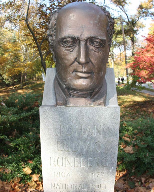 Fiberglass reproduction, from original plaster cast, of the missing bronze bust. Pillar text: Johan Ludvig Runeberg 1804-1877 National Poet of Finland Oi Maamme Suomi Synnyinmaa Our land, Finland. Our native land. O let her name ring clear. Finnish Central Committee. Cleveland Ohio